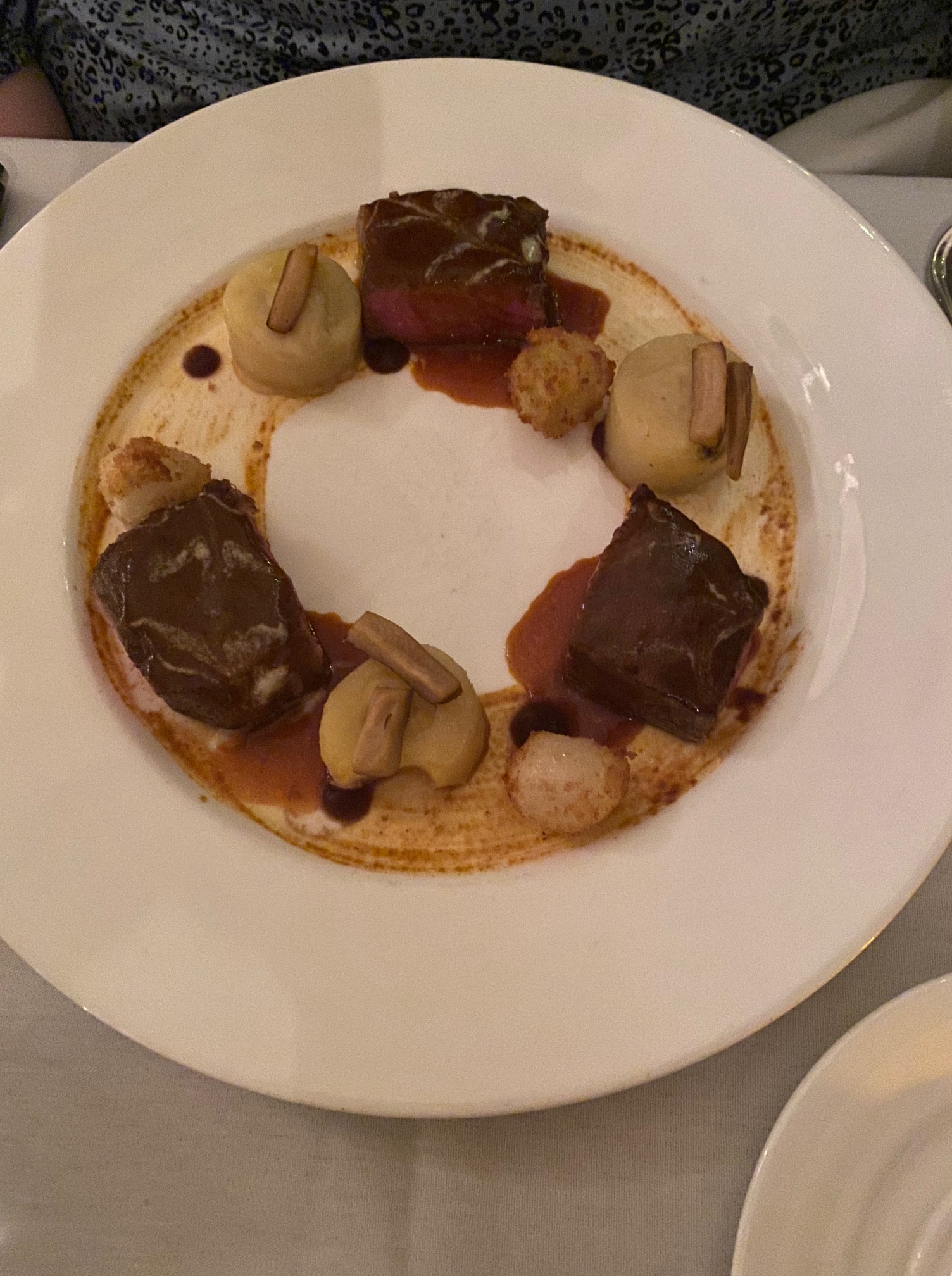 NY Steak with a red wine and rosemary reduction, potatoes and fried pearl onions