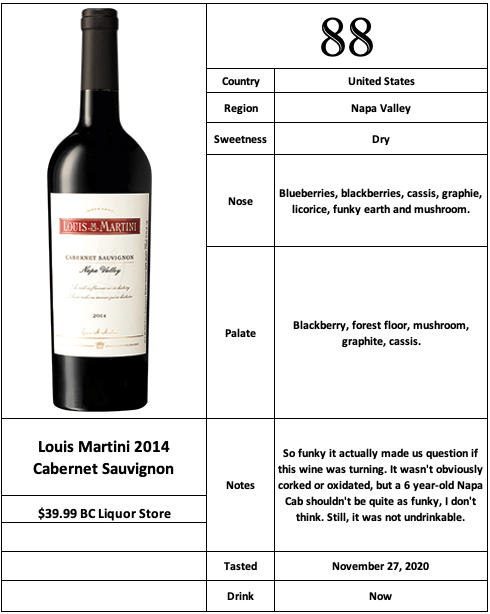 This is generally a great value, one that we pick up from the BC Liquor Store just to use as a “drink now” Napa Cab while our more serious stuff ages. This was the first bottle we have aged for a few years, and it sure didn’t need it. Well, now we know. BTW for those of you of the ‘budget conscious’ variety, their Sonoma County Cabernet sells for just $21 at the BC Liquor Stores, so probably less than that in other places, and is always a decent wine. Nice value….generally a $20 Napa Cab would make you question your sanity!